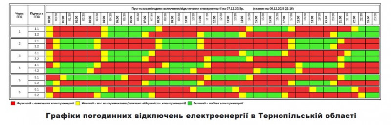 АТ "Тернопільобленерго" оприлюднило графік погодинних відключень електроенергії в області на неділю, 7 грудня.