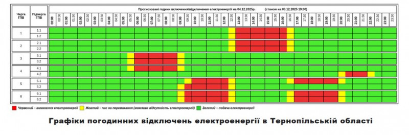 АТ "Тернопільобленерго" оприлюднило графік погодинних відключень електроенергії в області на четвер, 4 грудня.