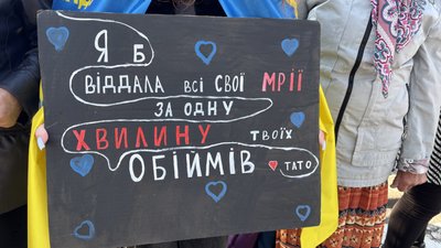 Люди тримали у руках державні прапори, фотографії своїх рідних та плакати з написами: "Я б віддала всі свої мрії за одну хвилину твоїх обіймів, тато", "Поверніть сина додому".