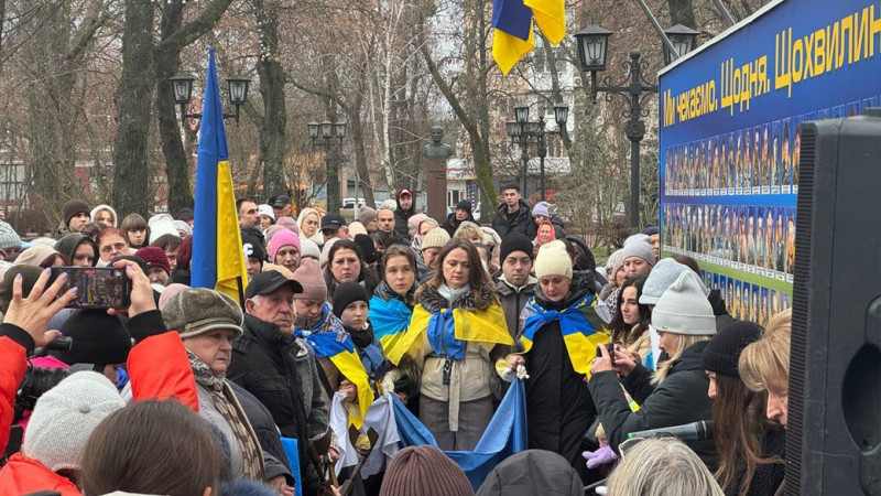 Люди біля банеру «Надії» у Прилуках 1 грудня 2025 року. Суспільне Чернігів/Надія Мартишко