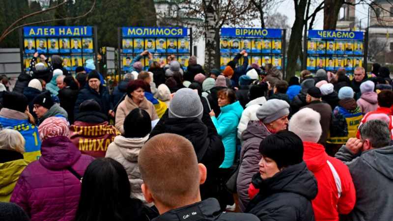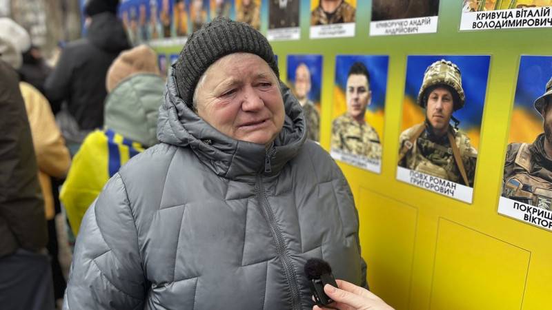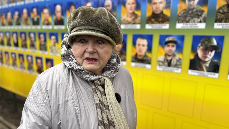 Люди біля банеру «Надії» у Прилуках 1 грудня 2025 року. Суспільне Чернігів/Надія Мартишко"Підходили сьогодні багато людей і запитували: «Чому немає фотографій нашого зниклого безвісти. В нас доступу до реєстрів немає – тільки ті, що приходили на акції, і ті люди, які дали дозвіл на розміщення фото. Тут зараз розміщено 118 фотографій. Ще одну я вже сьогодні зранку забрала. Це 119 фотографія, яку ми не встигли приклеїти. На жаль, це не всі. Близько 200 людей. Приблизна кількість, це у Прилуках тільки. Є також тут люди з району. Це ті, які ходили на акції з найперших днів".