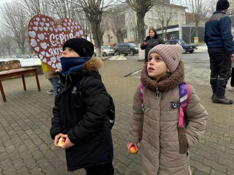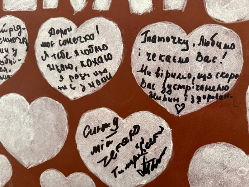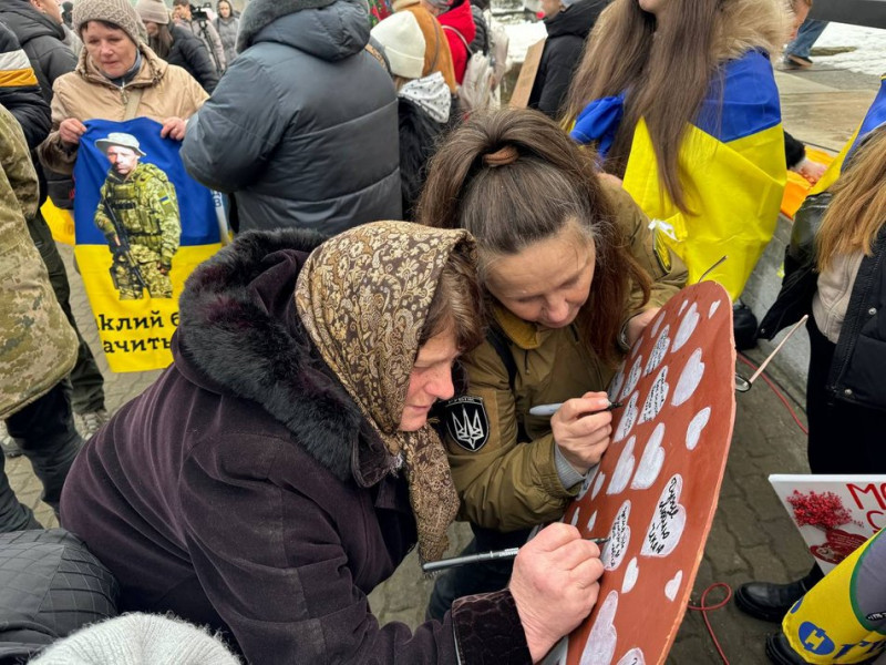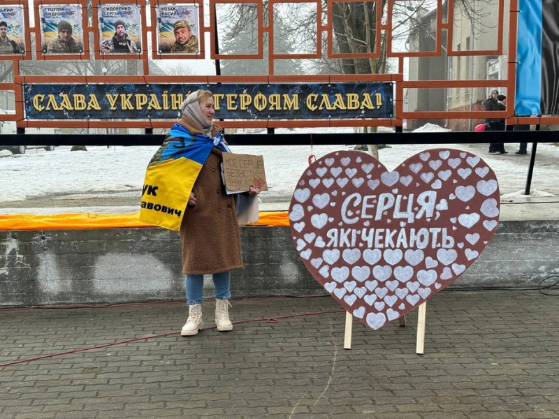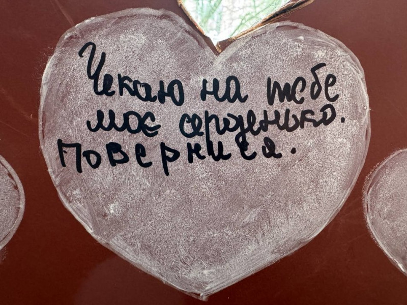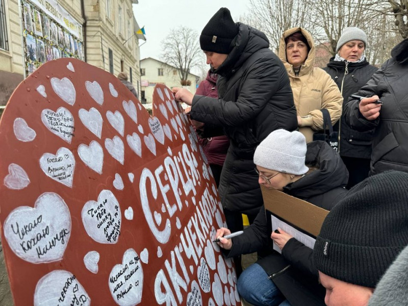 Поки Наталія розповідає, присутні на акції родичі зниклих безвісти на війні та полонених підходять до великого серця та пишуть свої побажання.
