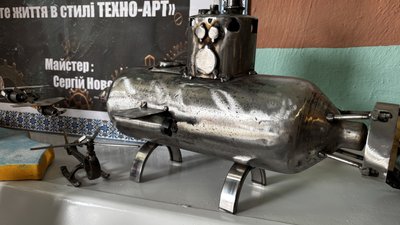 Так народжуються мініатюрні копії літаків, танків, гвинтівок, мотоблоків, мотоциклів, гвинтокрилів і біпланів. Окрім техніки, Сергій створює й інші металеві інсталяції — від підсвічників до підводних човнів, жіночих сумок і навіть фігур тварин.