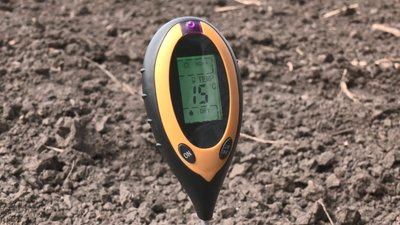 Чекаємо, коли аналізатор покаже, яка температура ґрунту. Якщо вона буде більше 8-10 градусів, то можемо заходити в поле і починати сіяти. Аналізатор показав 15 градусів, це означає, що можна сіяти".