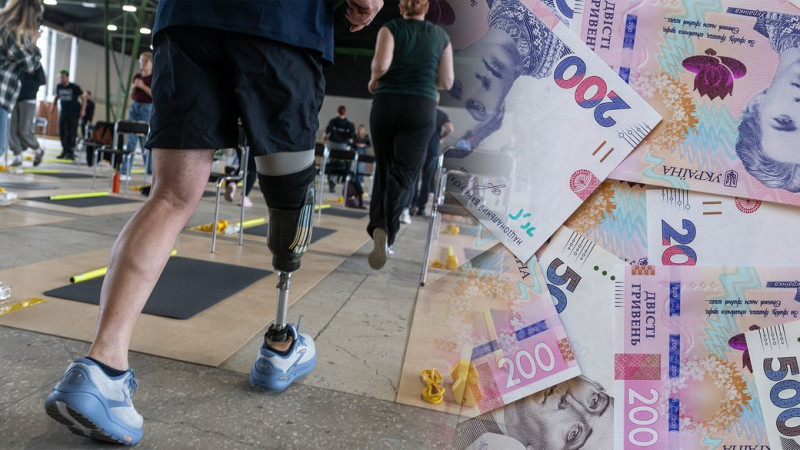 Колаж, на якому ветеран на протезі та гроші гривні. Колаж Суспільне Чернігів