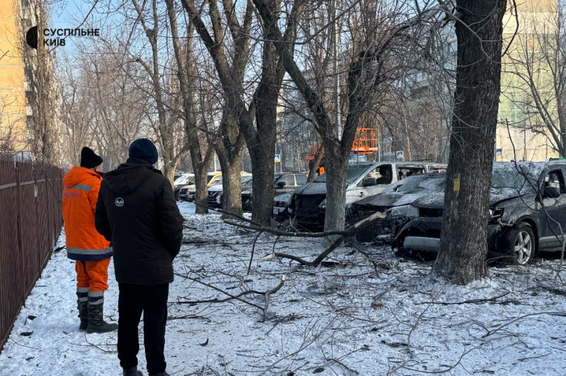 Люди стоять біля потрощених авто і поламаних дерев на бульварі Ігоря Шамо після нічної атаки РФ. Київ, 20 січня 2026 року. Суспільне Новини/Нікіта Галка