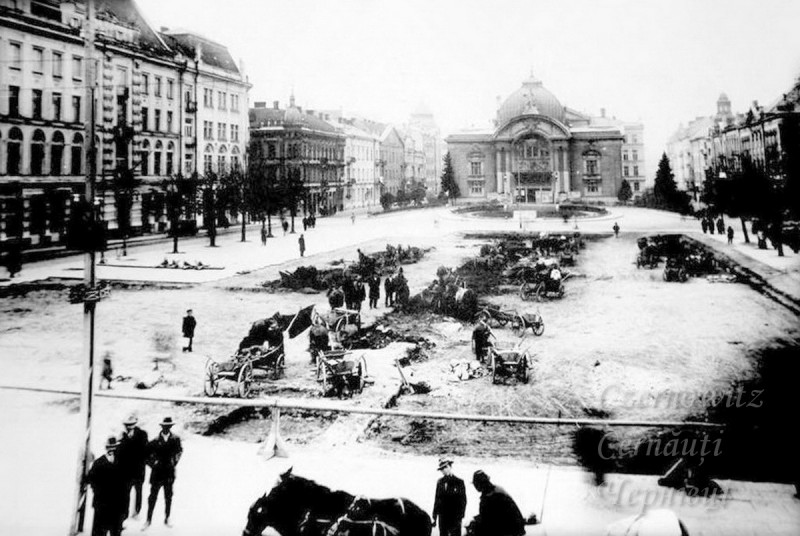 Площа Театральна у Чернівцях, фото до 1937 року, початок робіт із заглиблення центральної частини. Фото з архіву Edward Turkiewicz