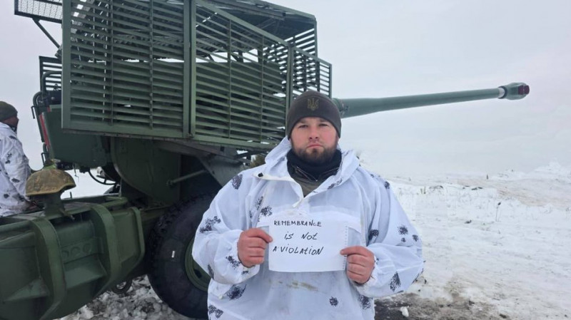 На знімках військові тримають білий аркуш паперу з написом RemembranceIsNotAViolation: "Пам'ять — не є порушенням".
