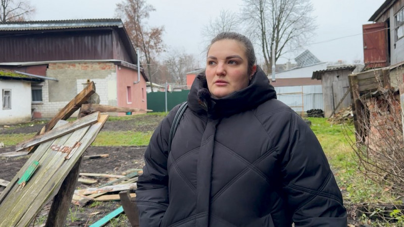 Любов Митюро біля зруйнованого будинку. Суспільне Чернігів