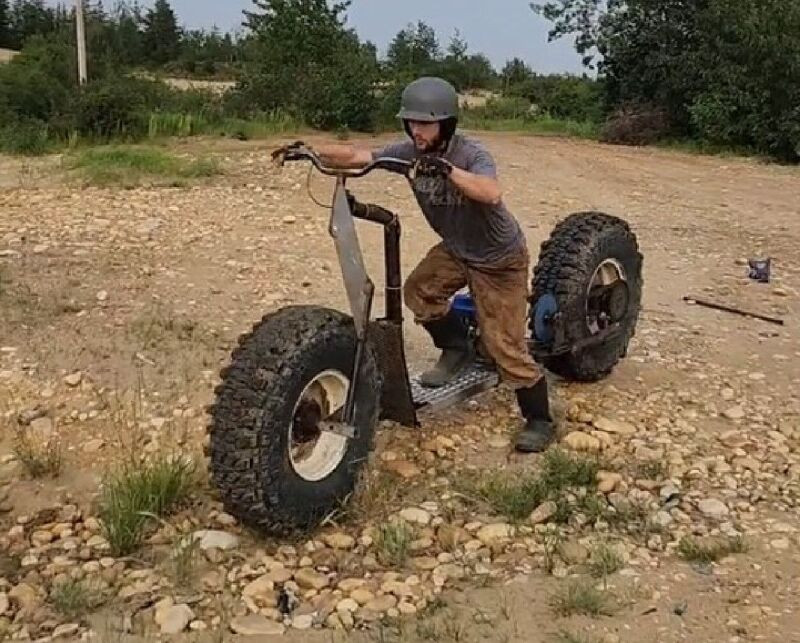 Ми підрахували, що створення незвичайного двоколісного скутера для бездоріжжя обійшлося автору не дорожче за $500. Наприклад, два колеса в такій специфікації коштуватимуть приблизно 50 доларів. 212-кубовий двигун – ще $200 (новий).