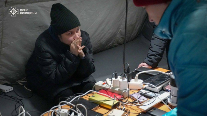 Люди заряджають гаджети у «пункті незламності» у Вишгороді під час блекауту, що тривав 4 доби. ДСНС Київщини/Telegram