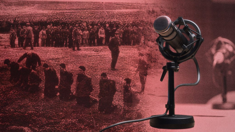 На колажі зображене місце розстрілів у Сандармосі та радійний мікрофон. Колаж Суспільне Чернігів