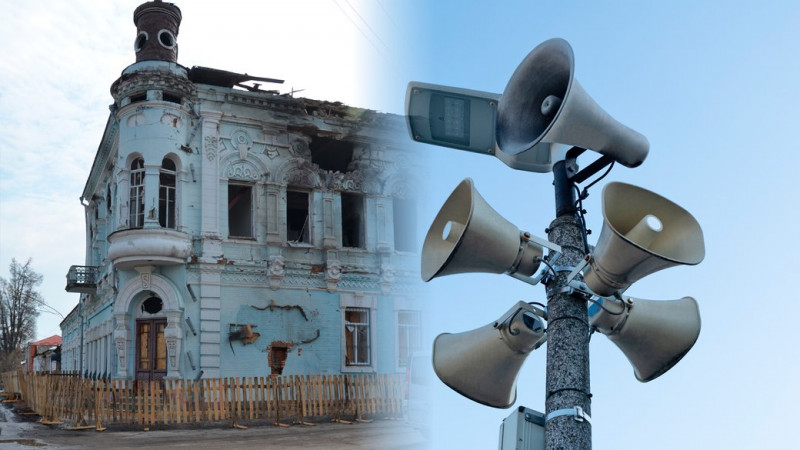 Пошкоджена будівля у Новгороді-Сіверському на Чернігівщині 13 березня 2026 року та система оповіщення. Суспільне Чернігів