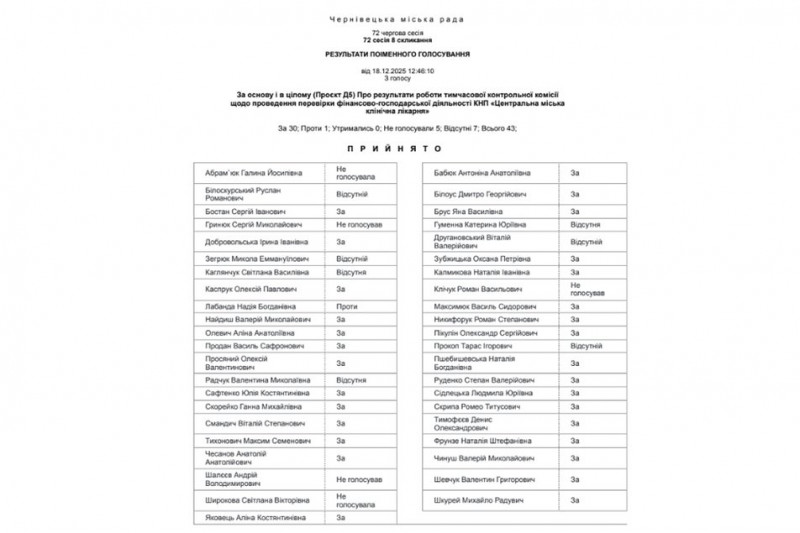 Результати поіменного голосування про результати роботи тимчасової контрольної комісії щодо проведення перевірки фінансово-господарської діяльності Центральної клінічної лікарні. Чернівецька міська рада