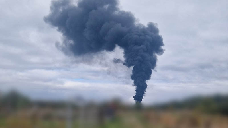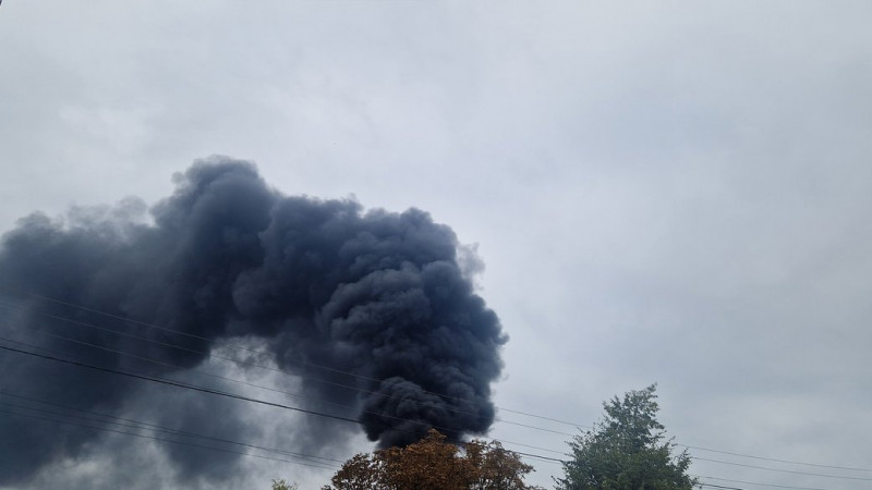 Дим у небі, після влучання російського БпЛА у запровачну станцію. Суспільне Чернігів