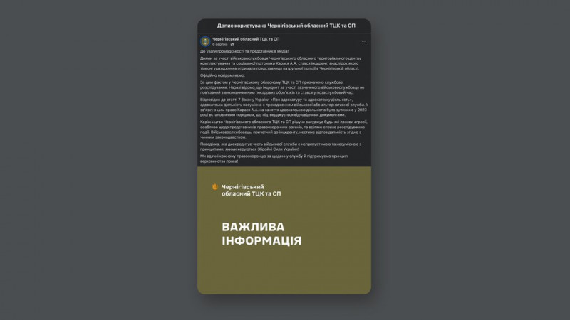 Допис Чернігівського обласного ТЦК та СП щодо конфлікту за участі їхнього військовослужбовця. Чернігівський обласний ТЦК та СП