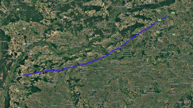 Загальна протяжність автодороги М-02 «Кіпті — Глухів — Бачівськ». Google Maps