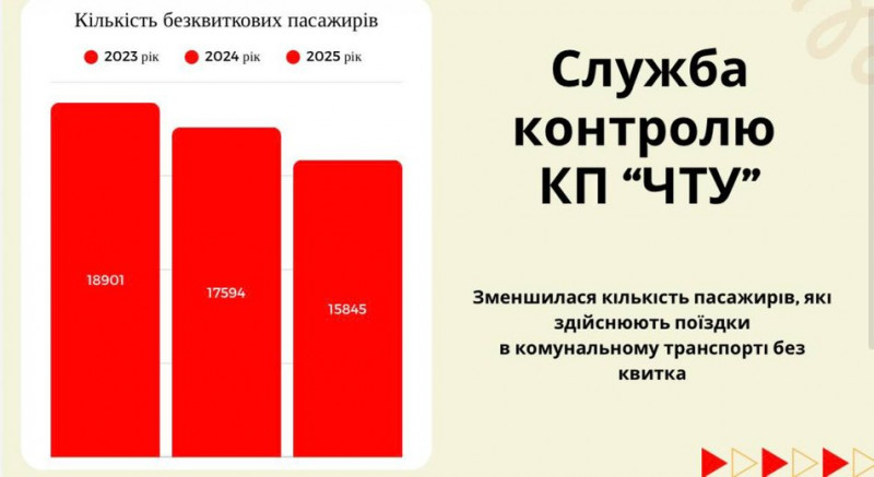 Кількість безквиткових проїздів у 2023, 2024 та 2025 роках. Презентація звіту директора «Чернівецького тролейбусного управління» Григорія Оробця"Служба контролю ЧТУ щоденно виходить на перевірку оплати проїзду і бачимо, що кількість пасажирів, які не купляють квитки, зменшується. Це може говорити про добросовісність наших пасажирів, які їздять, що вони свідомо стали більше оплачувати", — каже Григорій Оробець.
