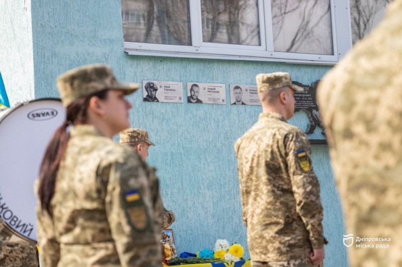 Меморіальні таблички військовим на фасаді гімназії № 132, випускниками якої були загиблі. Дніпровська міська рада