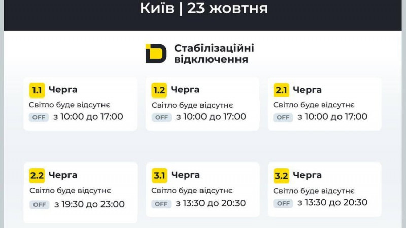 Напередодні ДТЕК оприлюднив графіки стабілізаційних відключень для Київської області на 23 жовтня.