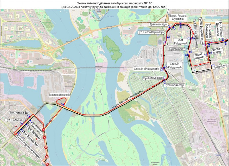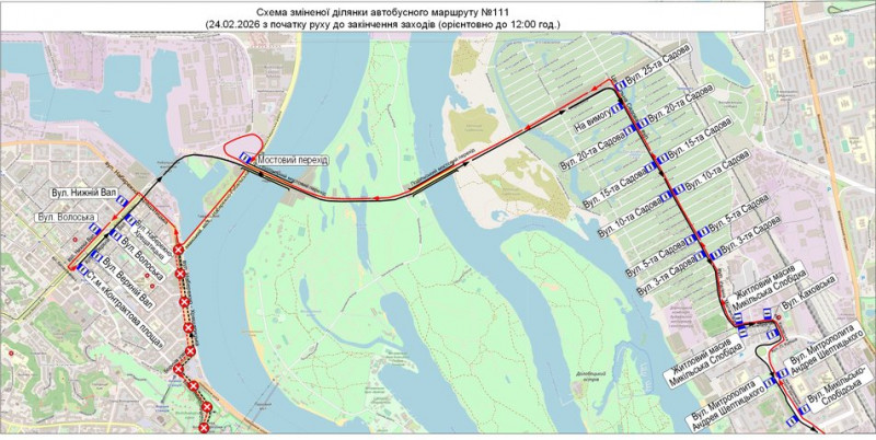 - автобуси № 110 та № 111 із початку руху і орієнтовно до 12:00 курсуватимуть відповідно від вул. Милославської та Дарницької площі до Гаванського мосту за звичними маршрутами, далі — вул. Набережно-Хрещатицькою, вул. Нижній Вал, вул. Костянтинівською, вул. Верхній Вал, ст. м. "Контрактова площа". У зворотному напрямку — вул. Верхній Вал — Подільський мостовий перехід — далі за звичними маршрутами. Маршрути працюватимуть під номерами 110А та 111А