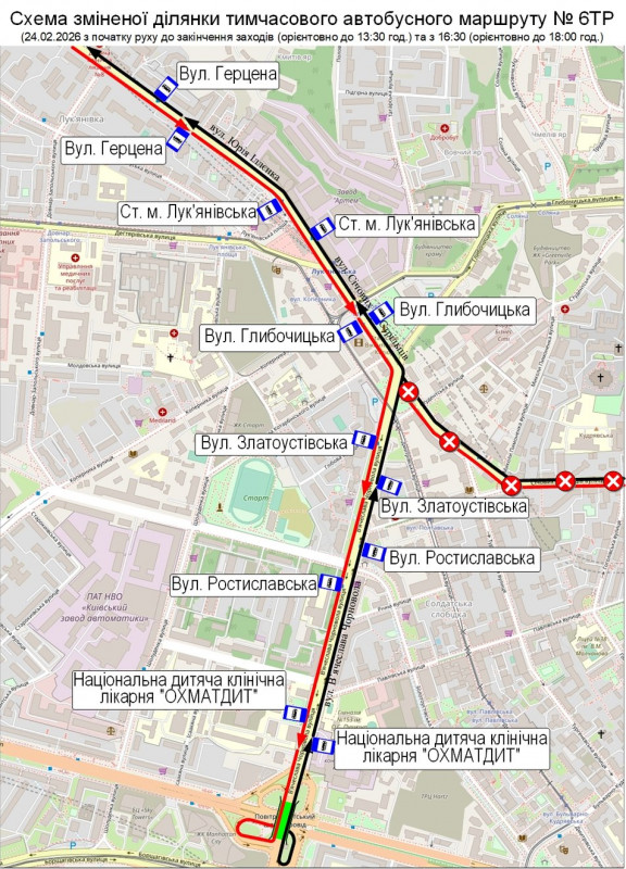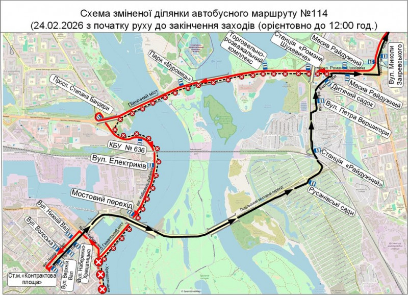 - автобуси маршруту № 114 із початку руху орієнтовно до 12:00 курсуватимуть від вул. Милославської до Гаванського мосту за звичним маршрутом, далі — вул. Набережно-Хрещатицькою, вул. Нижній Вал, вул. Костянтинівською, вул. Верхній Вал, ст. м. "Контрактова площа". У зворотному напрямку — вул. Верхній Вал — Подільський мостовий перехід — під’їзна дорога до Подільського мостового переходу — вул. Петра Вершигори — просп. Романа Шухевича — просп. Червоної Калини — далі за звичним маршрутом до вул. Радунської. Маршрут працюватиме під номером 114А