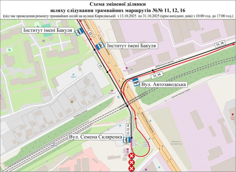 Схема зміненого маршруту трамваїв №11, 12, 16. КМДА