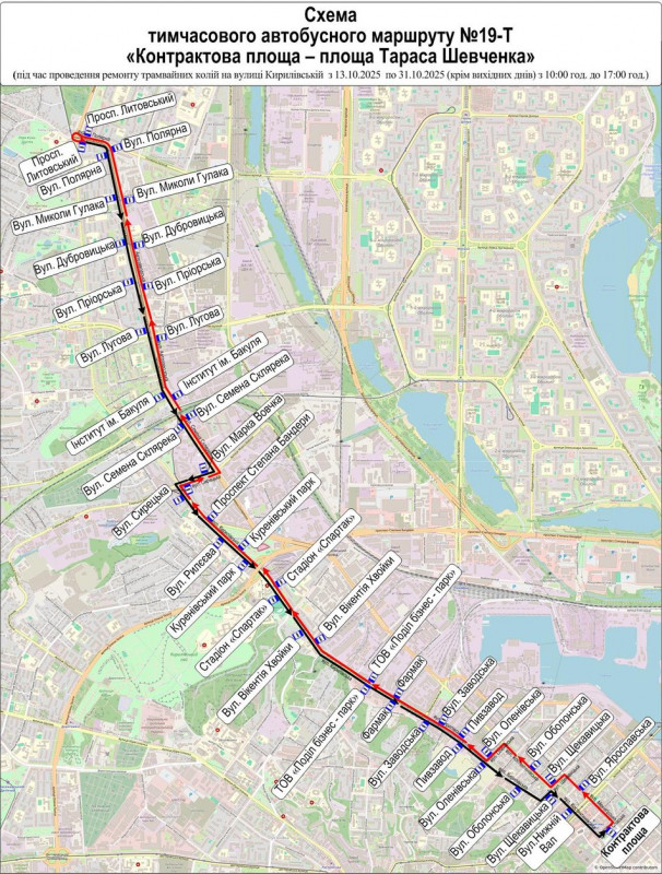 Також для перевезення пасажирів від Контрактової площі до площі Тараса Шевченка організують тимчасовий автобусний маршрут №19-Т:
