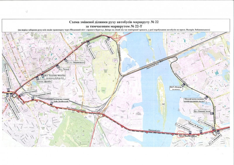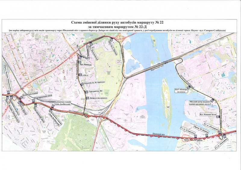 Схема тимчасового автобусного маршруту 22-Д під час оголошення повітряної тривоги. КМДА