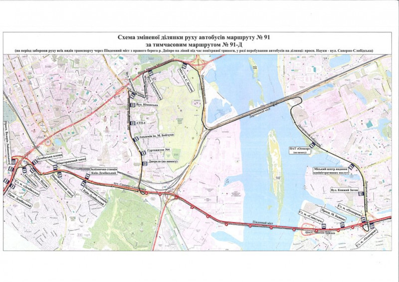 Схема тимчасового автобусного маршруту 91-Т під час повітряної тривоги. КМДА