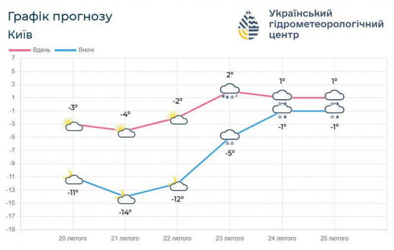 З 21 по 25 лютого у Києві та області синоптики прогнозують різкі погодні коливання з переходом від сильних морозів — подекуди до -20°C — до плюсових температур.