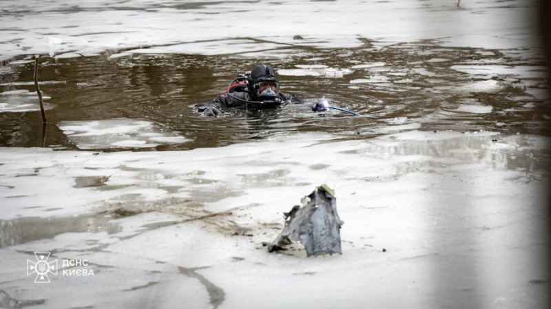 Сапер ДСНС дістає з річки залишки російської ракети. ДСНС Києва