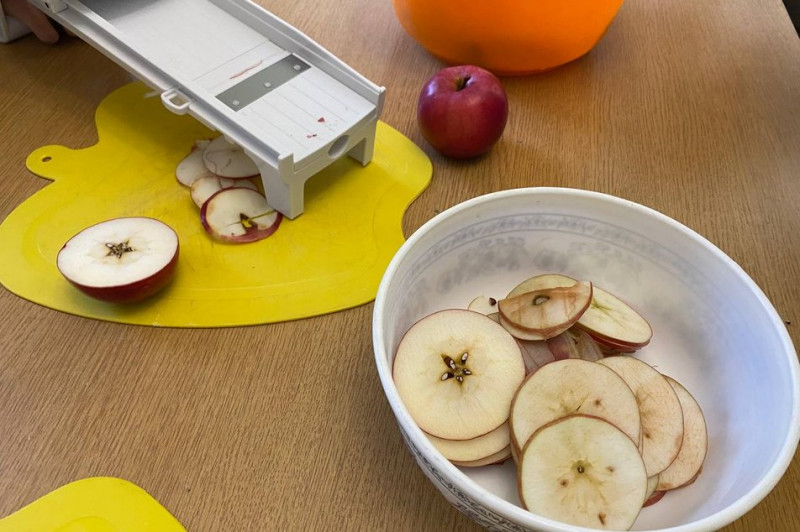 Як нарізати яблука слайсами за допомогою овочерізки — учасникам показує соціальний педагог Дмитро Гаврилюк.