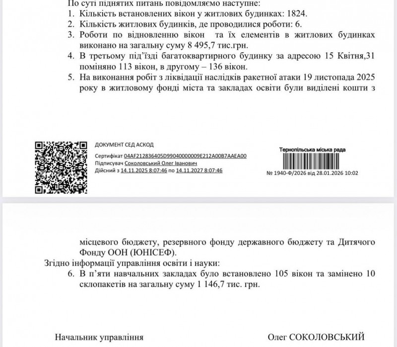 "У третьому під’їзді багатоквартирного будинку за адресою 15 Квітня, 31, замінили 113 вікон, в другому – 136 вікон. На виконання робіт з ліквідації наслідків ракетної атаки 19 листопада 2025 року в житловому фонді міста та закладах освіти були виділені кошти з місцевого бюджету, резервного фонду державного бюджету та Дитячого Фонду ООН (ЮНІСЕФ)", — відповів Олег Соколовський.