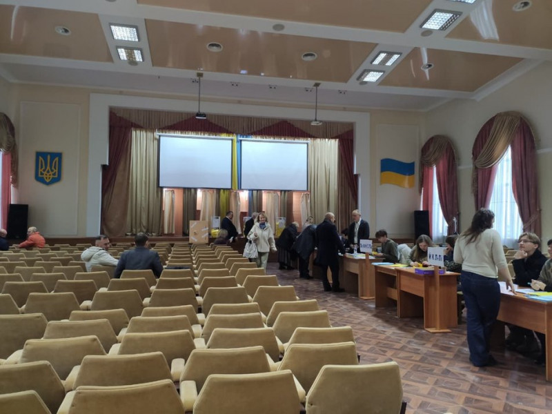 "Процедуру виборів здійснюють під запис. В актовому залі є дві камери, які записують хід голосування. Є сейф, у якому на випадок форсмажорних обставин опечатують невикористані бюлетені. Їх за межі виборчої дільниці не переносять".