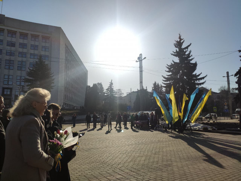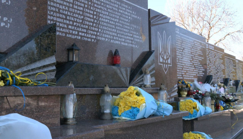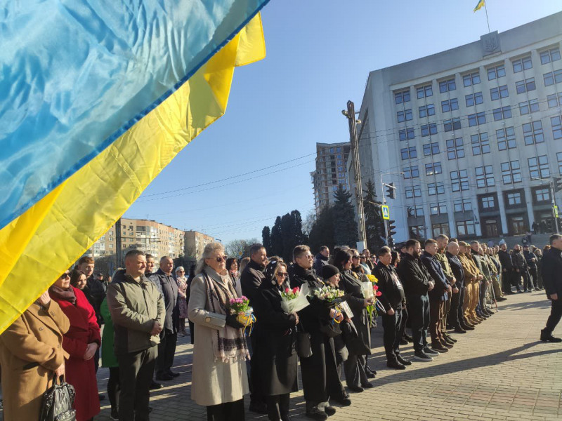 Представники влади, військові та ветерани, а також родичі загиблих бійців поклали квіти до меморіальної стели "Воїнам, загиблим за волю України".