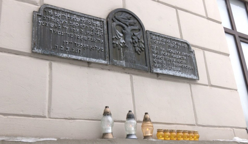 "27 січня весь світ відзначає пам’ять жертв Голокосту. На цьому місці було єврейське гетто. Із цього місця почалися перші розстріли євреїв Тернополя. Проживало в Тернополі у 1941 році 17 тисяч євреїв.
