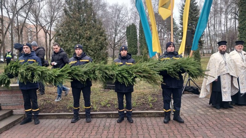 До підніжжя пам'ятника поклали вінок зі соснових гілок, квіти та лампадки.