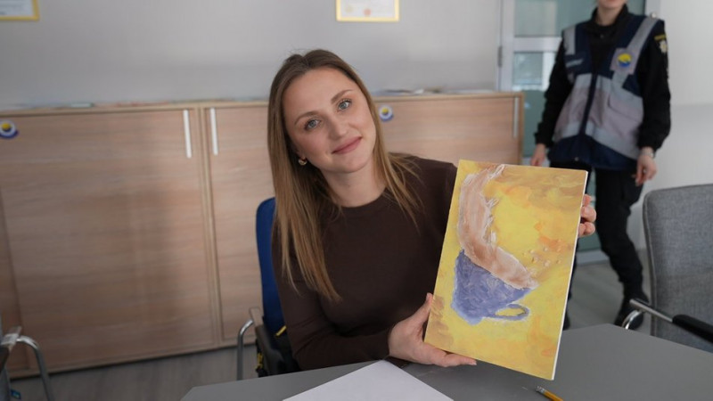 "Працював у поліції 13 років. У 2025 році пішов у стрілецький батальйон. Зараз він на Донецькому напрямку. Ми, як жінки чиї чоловіки воюють, вклала надію, що буде перемога, і усі наші захисники повернуться, і разом з ними чоловік, моя кохана половинка. Він побачить мою картину, він був два тижні у шпиталі, а зараз іде знову на позиції", — сказала Олена Яровенко.