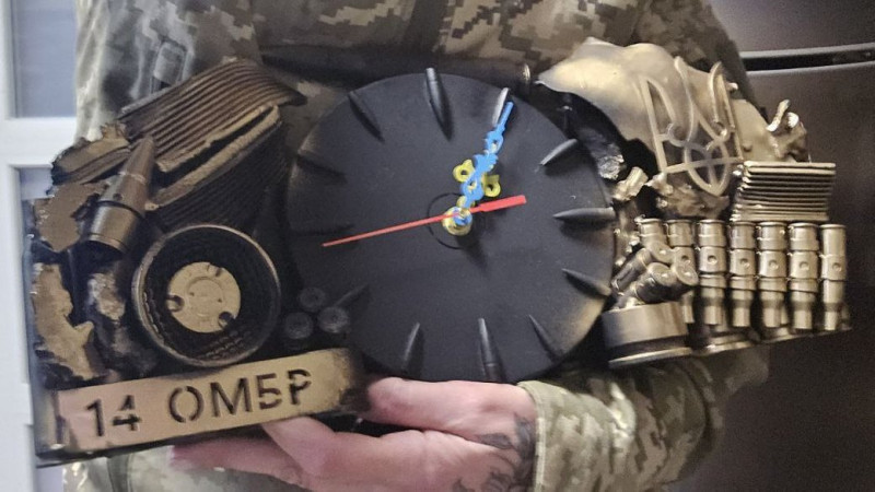 За її словами, годинник виготовили військовослужбовці 14 окремої механізованої бригади імені князя Романа Великого під час служби. На циферблаті замість цифр — відстріляні кулі, що символізують зворотний відлік часу до перемоги України.