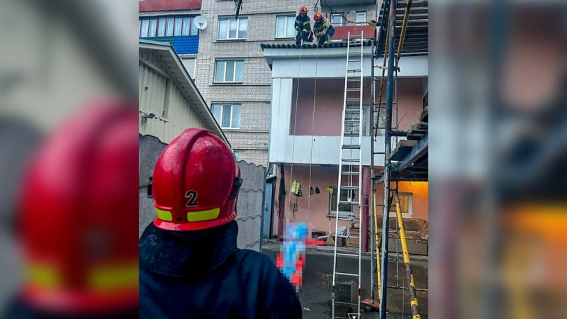 Рятувальники спускають тіло жінки з даху прибудови сусіднього двоповерхового будинку. ДСНС