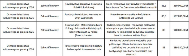 Скрин з переліку об’єктів культурної спадщини за кордоном, на які польський уряд виділить гроші у 2026 році. Сайт Міністерства культури та національної спадщини Польщі