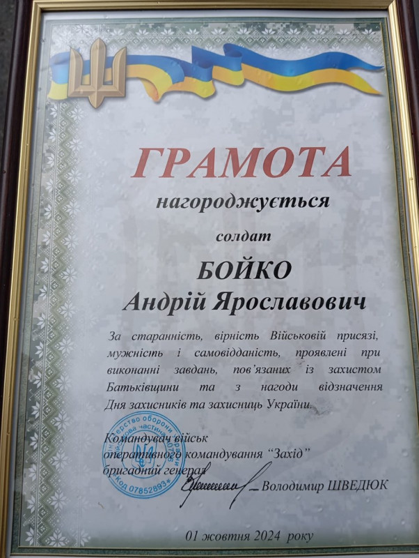 Грамота від оперативного командування «Захід». Андрій Бойко