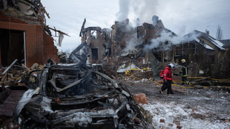 Рятувальники розбирають завали будинків, поруйнованих атакою РФ у Софіївській Борщагівці на Київщині, 22 лютого 2026 рік. Суспільне новини/Олександр Магула