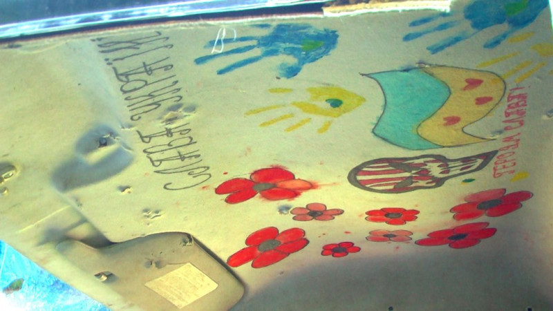 Дитячими долонями, маками і синьо-жовтим прапором обшивку салону прикрасили діти Олега. Вони ж і заклеїли пробиті дірки. Передні фари, розповідає Сагайдак, взяв від іншого автомобіля. Дірки від осколків заварили, машину пофарбували.
