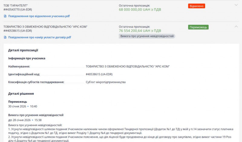 Водночас фірма “Аріс-ком” до 28 січня мала усунути 18 невідповідностей.