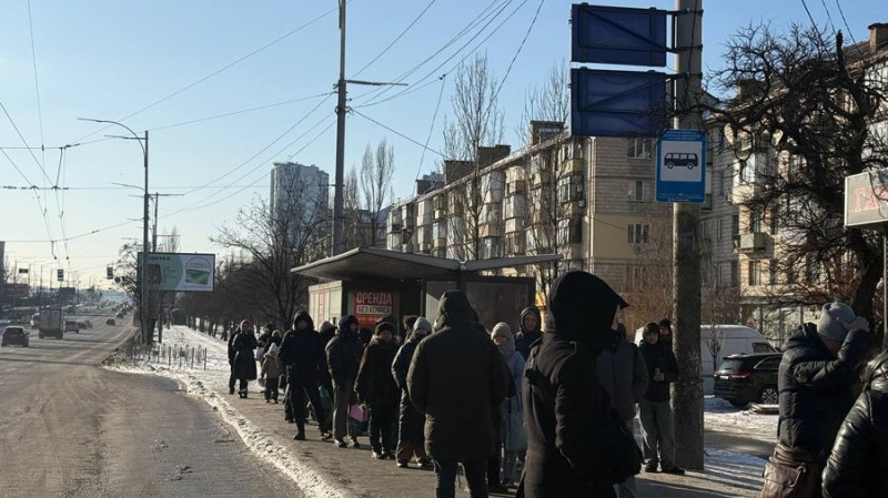 Люди чекають на громадський транспорт біля Дарницької площі під час припинення роботи метро в Києві, 31 січня 2026 року. Суспільне Новини/Анна Железняк